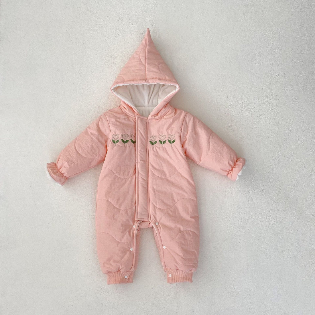 Baby Girl Flower Embroidered Quilted Hooded Romper