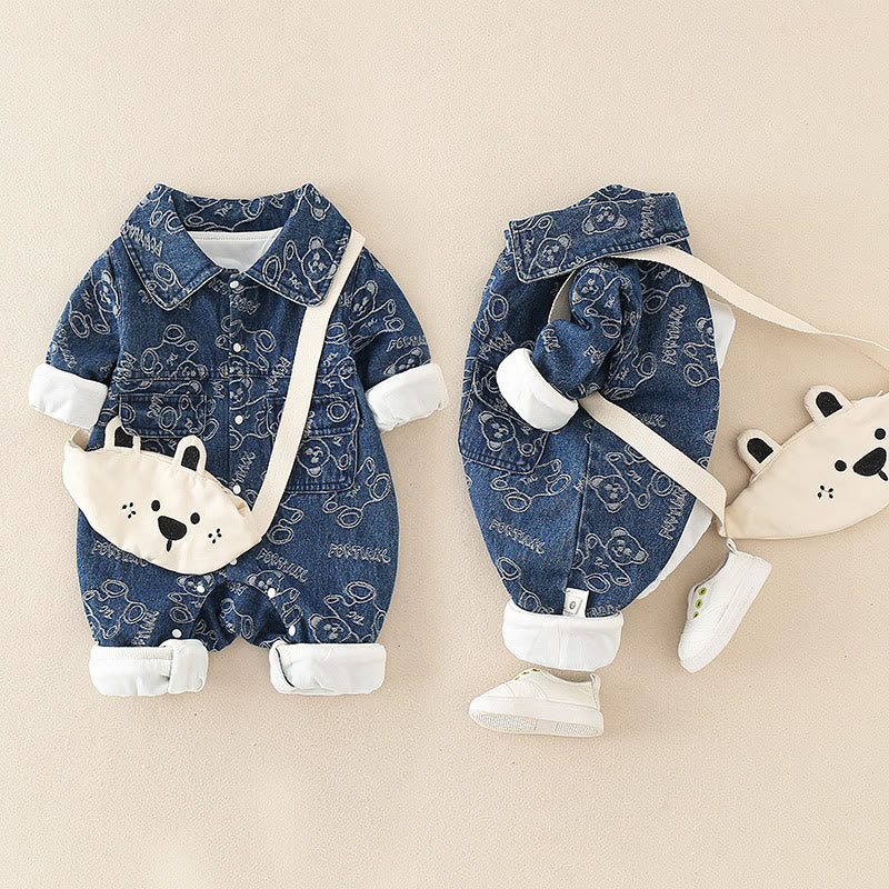 Baby Lapels Denim Teddy Slogan Romper with Bag