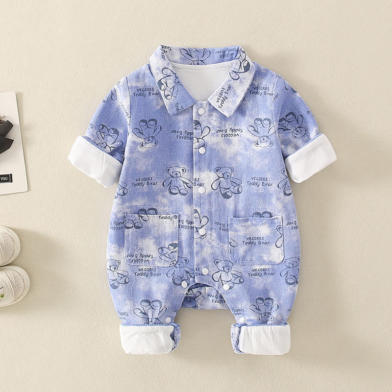 TEDDY BEAR Baby Cartoon Blue Denim Pocket Romper