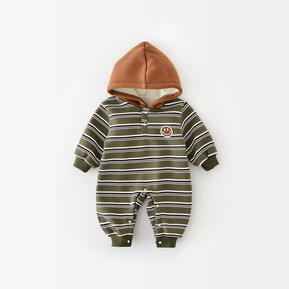Baby Smile Green Striped Fleece Lined Hooded Romper
