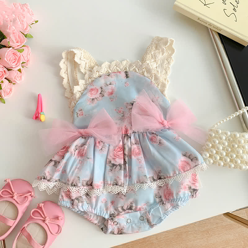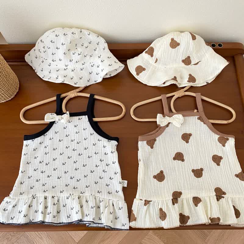 Baby Bear Floral Bowknot Strap Dress with Hat