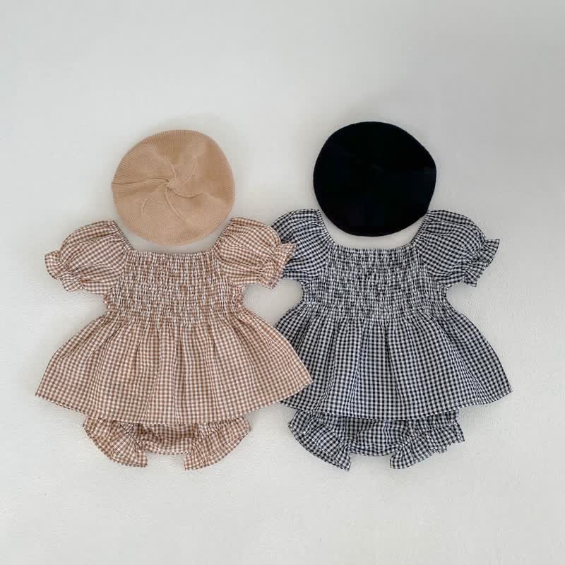Baby Plaid Flower Camisole Bloomer Hat Set