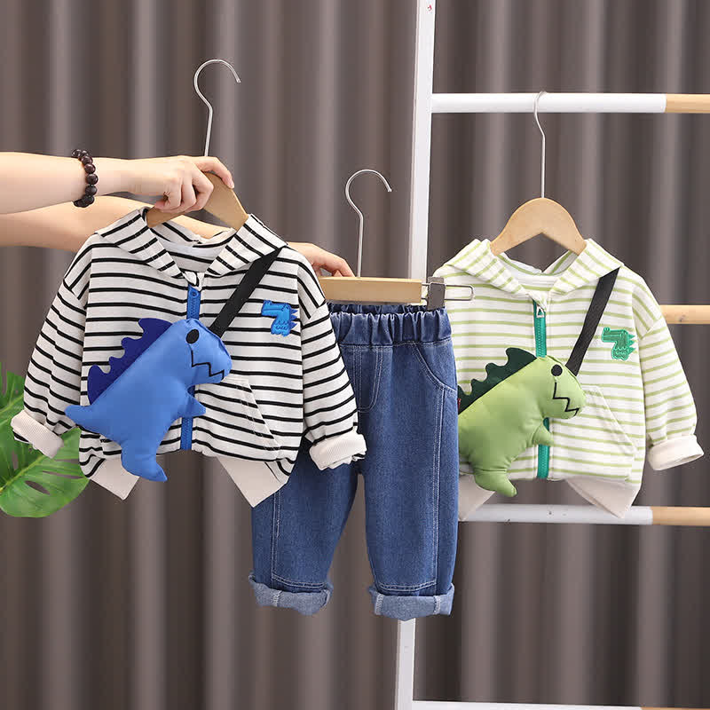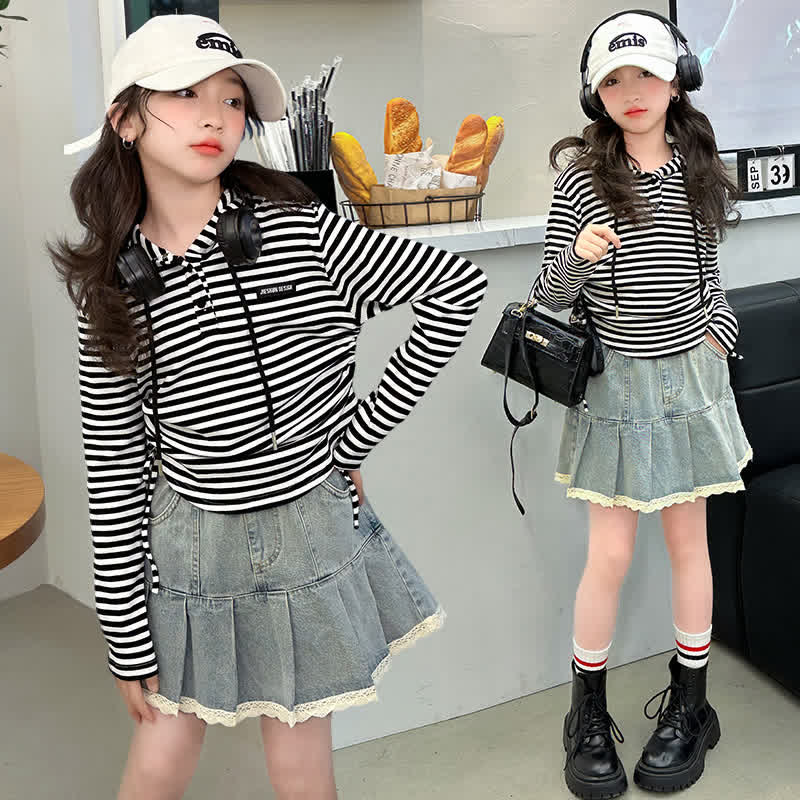 Kid Girl Striped Hooded Pleated Denim Skirt 2-piece Set