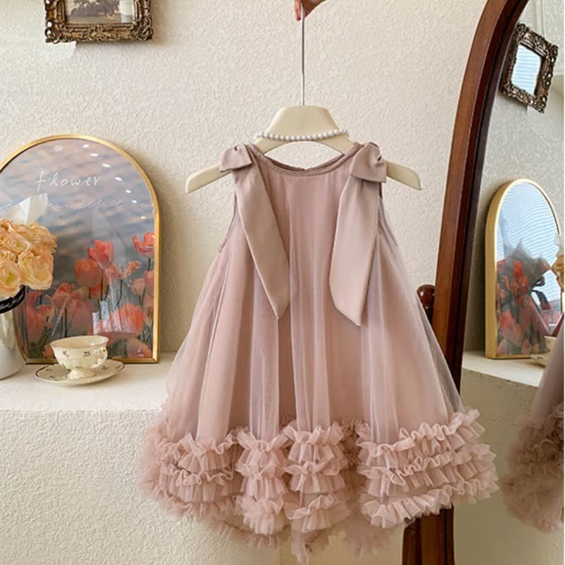 Kid Girl Bows Ribbon Strap Sleeveless Mesh Princess Dress