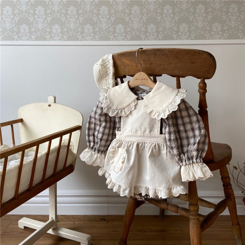 Baby Plaid Lapels Romper with Apron 2 Pieces Set