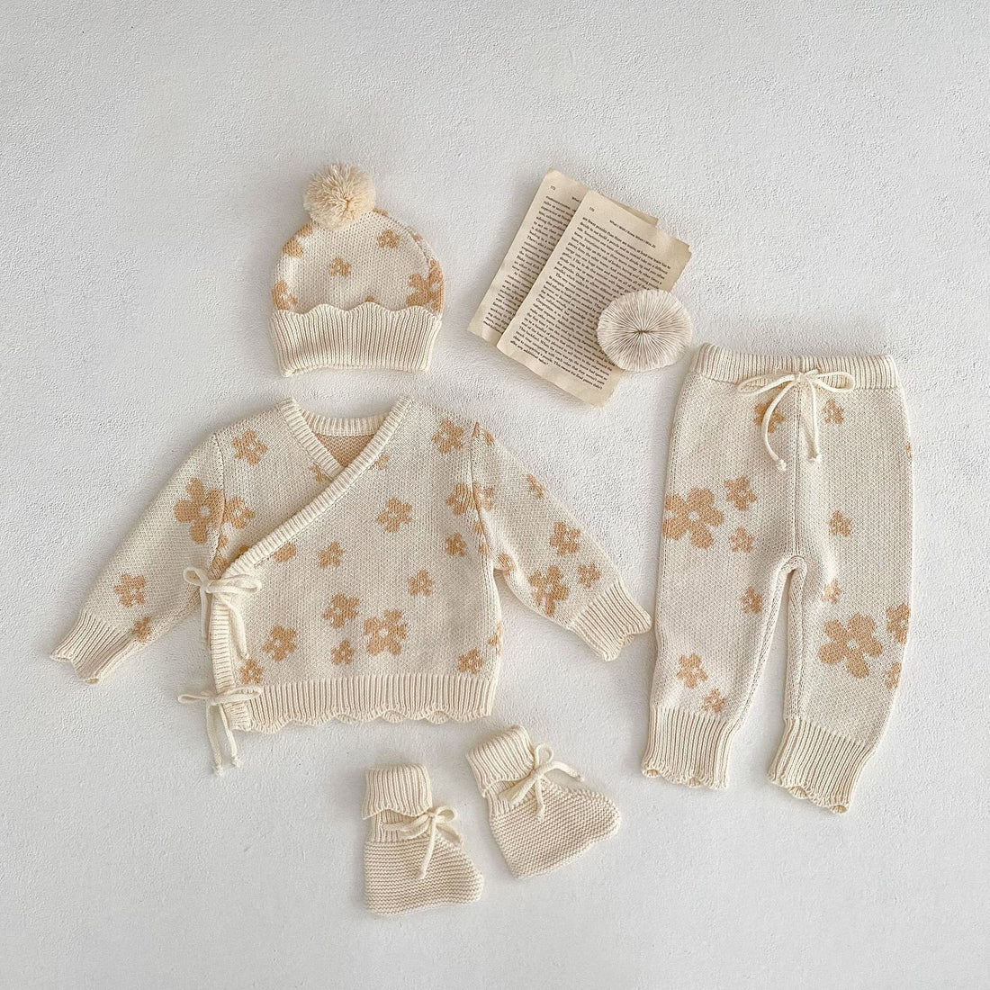 Baby Knitted Kimono Flower Sweater Pants Hat Socks