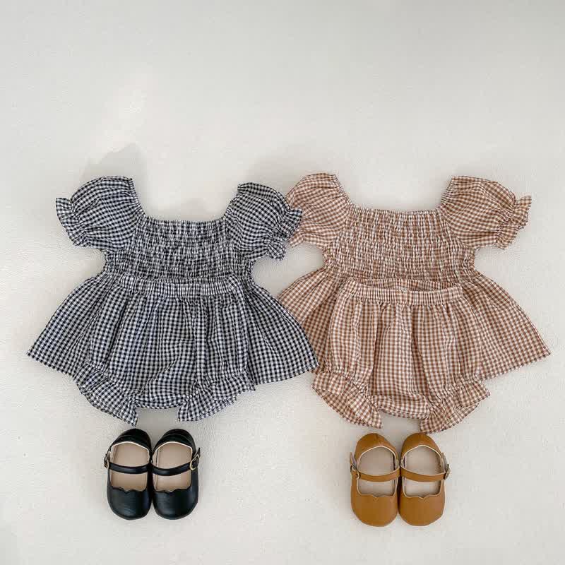 Baby Plaid Puff Sleeve Blouse and Bloomers Set