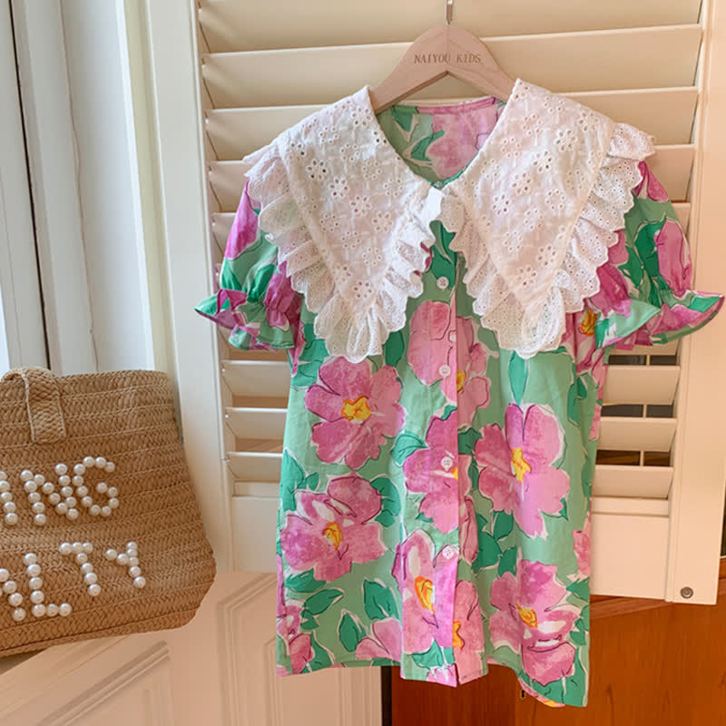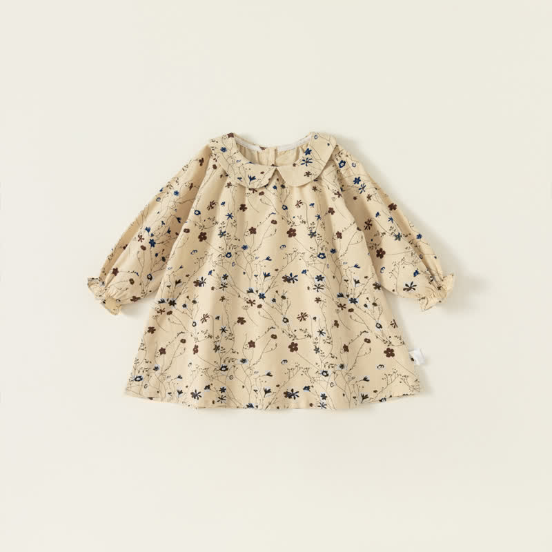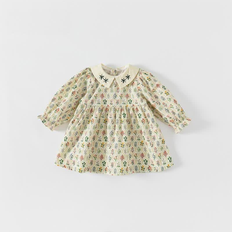 Toddler Girl Retro Flower Crew Neck Lapel Collar Dress