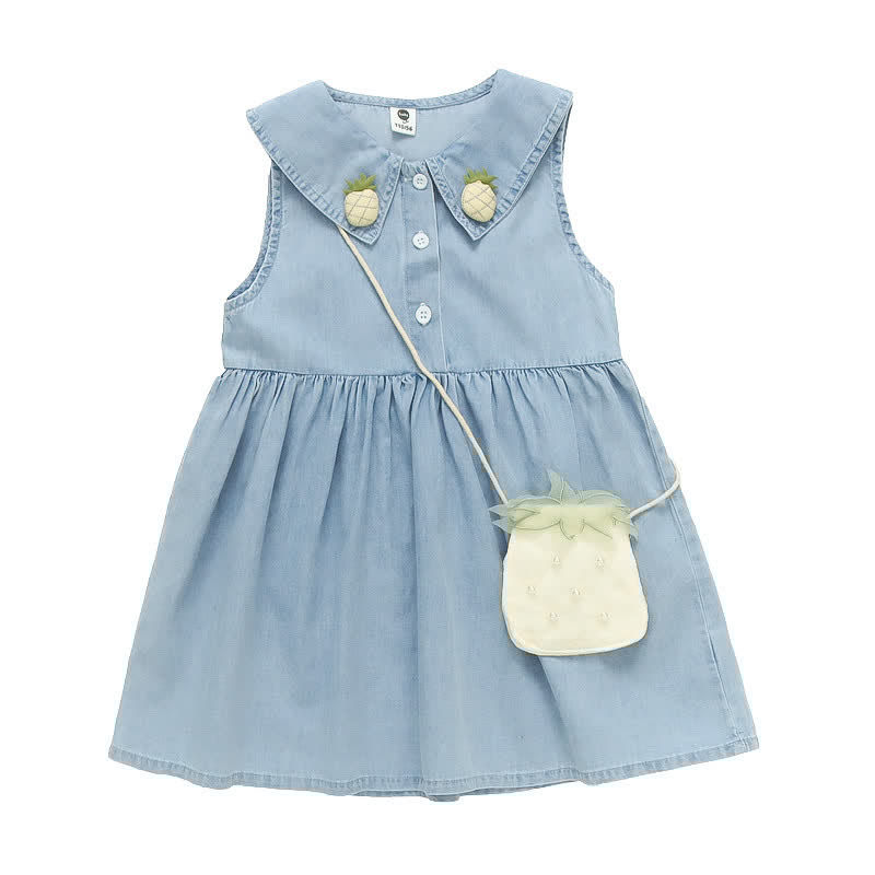 Toddler Girl Pineapple Lapel Collar Denim Dress with Bag