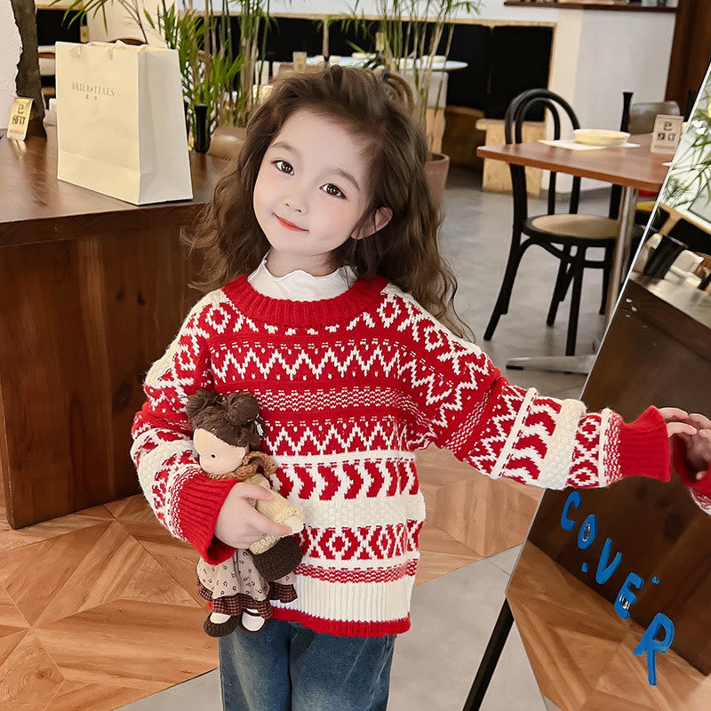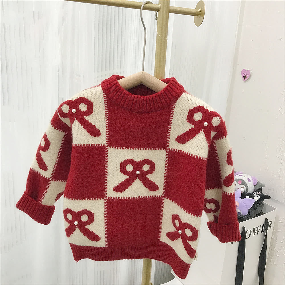 Toddler Girl Bowknot Red Plaid Knitted Sweater
