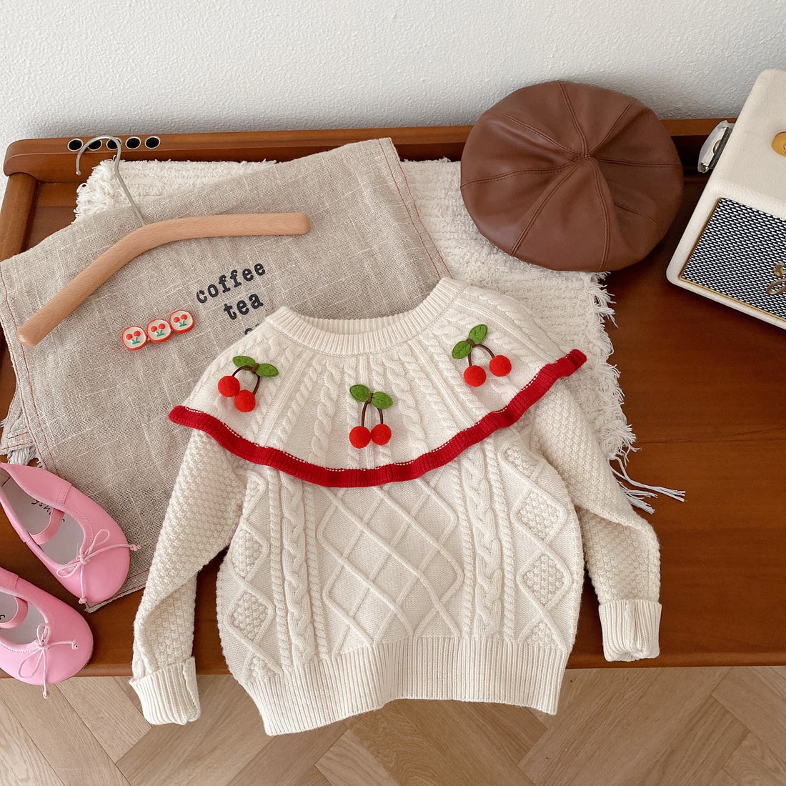 Toddler Girl 3D Cherry Beige Shawl Collar Sweater