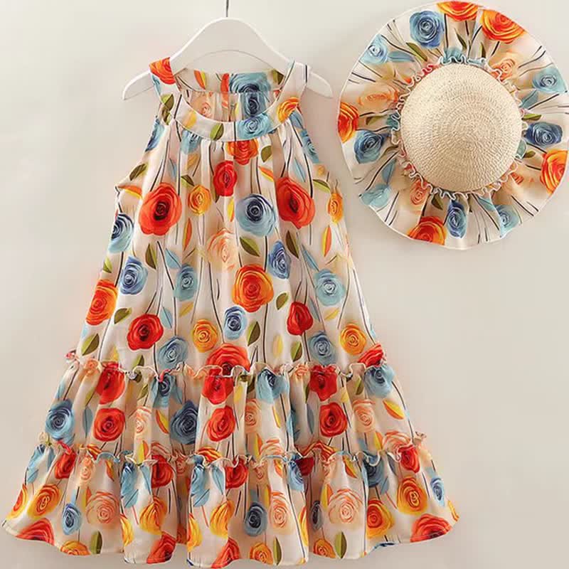 Kid Girl Bohemian Resort Halterneck Rose Dress with Hat