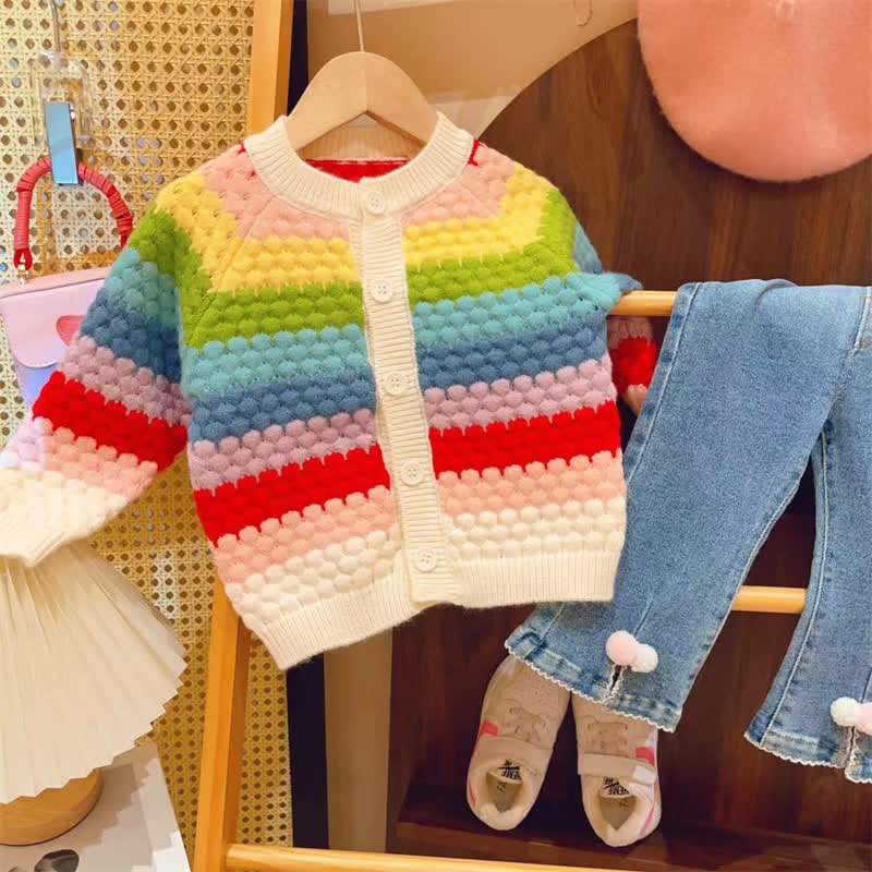 Kid Girl Rainbow Colored Knit Cardigan Sweater